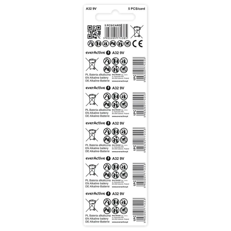 Батериите everActive A32 / 32A 9V (5 броя в блистер) са надеждният избор за автомобилни дистанционни, алармени системи, безжични звънци и множество други устройства. Те съчетават екологично производство, подсилена конструкция, висока енергийна плътност и дълъг срок на годност, което ги прави перфектния избор за всяко приложение, където се изисква сигурна и продължителна работа.